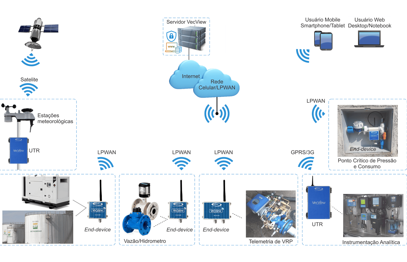 - Telemetria de pressão e/ou vazão em redes de distribuição de água;